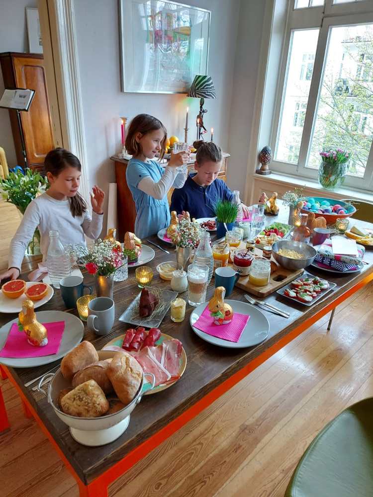 Wir haben ein ganz tolles Frühstück gemacht am Ostersonntag mit allem, was das Herz begehrt. Der Tisch war picke packe voll. Meine Mama hat ein Osterlamm und einen Osterhasen gebacken und einen Hefezopf. Wir haben uns alle testen lassen und dann kamen Martina und Sean auch zum Frühstück. Martina ist eine gute Freundin von Mama und hat sich auch extra für das Frühstück morgens testen lassen, damit wir ohne Maske drinnen sitzen konnten. Sean ist Mams Freund und so sind sie sowieso ein Haushalt – also alles voll korrekt.
